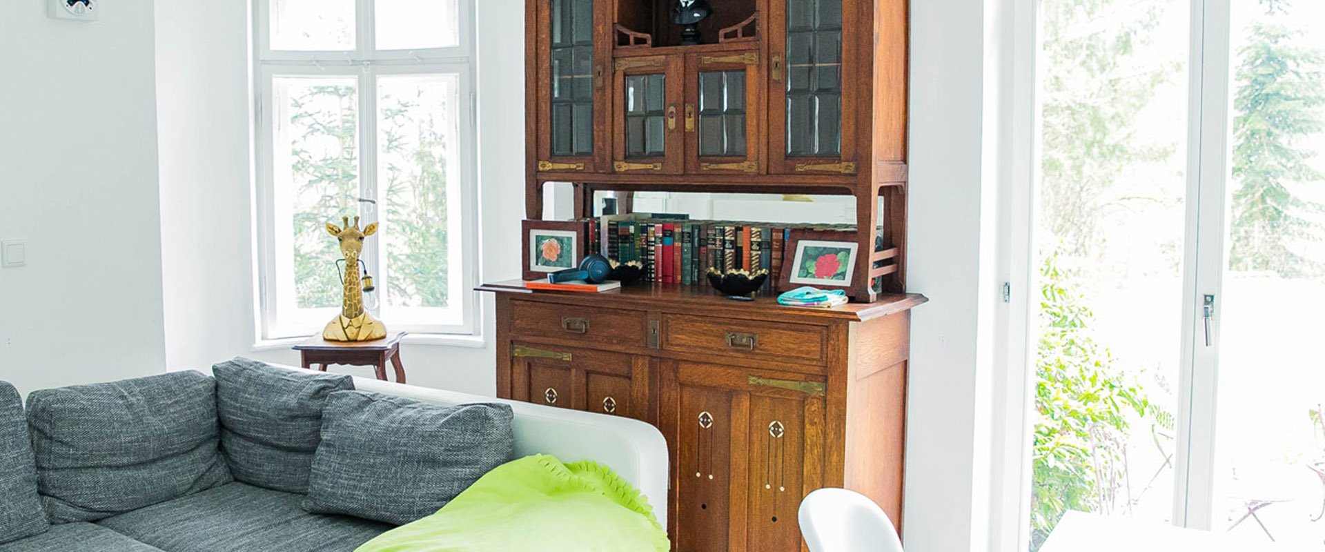 In allen Räumen stilvolle und historische und moderne Möbel und Dekorationsgegenstände.